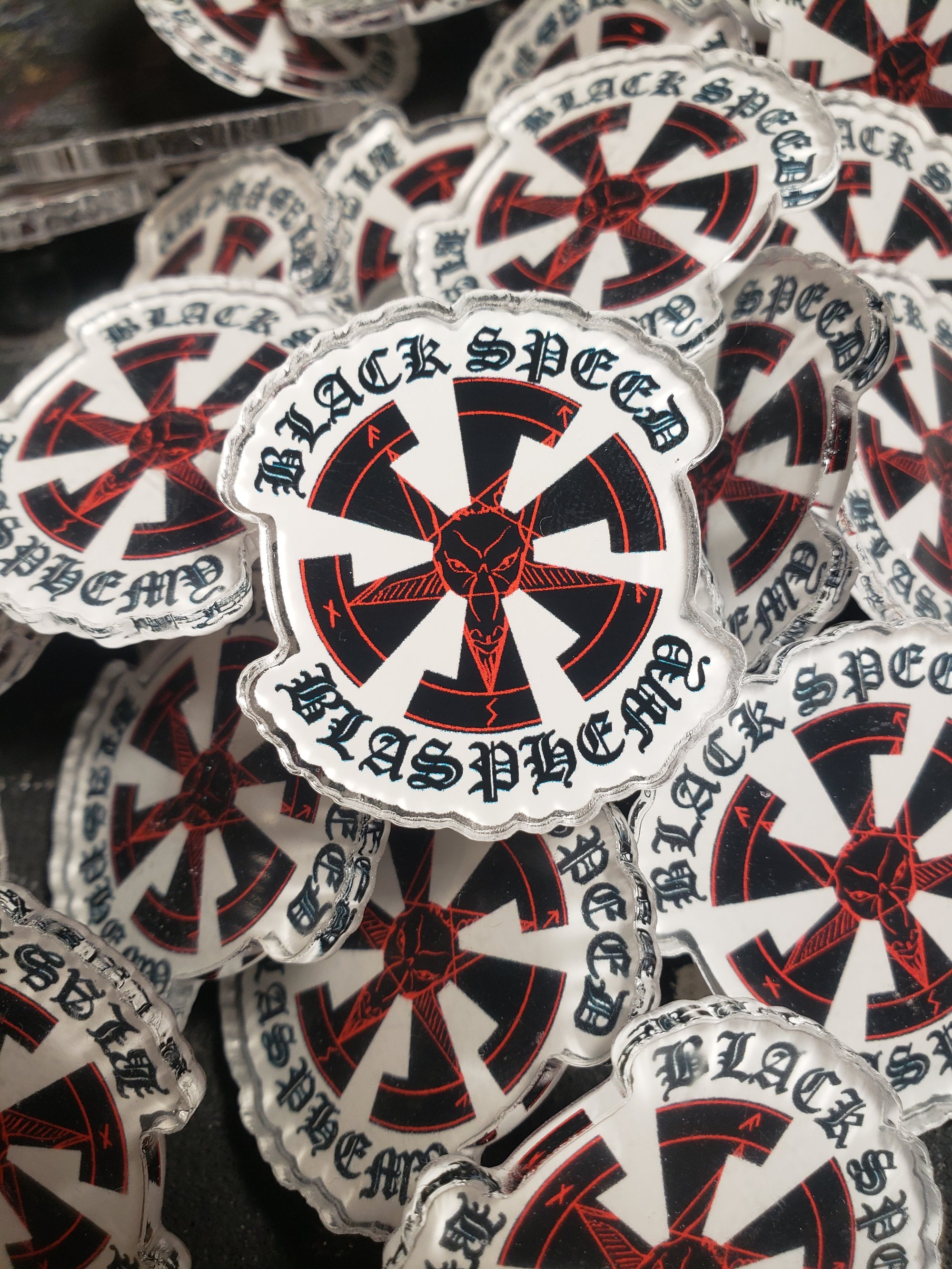 To warm you up for the Blitz patch release, we have a special surprise; pins! This pin features a design made by Evil Eye herself, which I immediately grew attached to. The speed swirl is a favourite design of mine, and to throw it in with a pentagram and some lovely old English text fits swimmingly.
